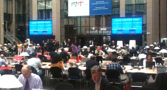 Er was gisteravond veel onduidelijkheid in de perszaal over de nieuwe steunpakket. Franse journalisten vroegen aan hun Duitse collega’€™s hoe het precies zat, die op hun beurt vertwijfeld naar de Italianen keken. De Nederlandse journalisten wisten het ook niet helemaal zeker belden voor de zekerheid nog even met de woordvoerder van de @MinPres. Het antwoord kwam in de vorm van een smsje. Maar tot diep in de nacht waren de belangrijkste zinnen in de kroegen rondom het Schumanplein “Is het nu 159 of 109 miljard?” en “Nog iets drinken?”.
